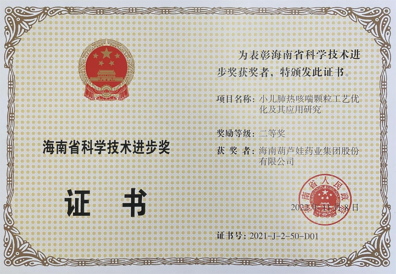 为此,小儿肺热咳喘颗粒的制备方法获得了第二十一届中国专利优秀奖(2019年),专利申请号:ZL201010134951,此次作为专利技术的应用,获得了2021年度海南省科学技术进步奖二等奖。在此之前,乐发牌小儿肺热咳喘颗粒还多次被授予“临床价值中成药品牌”、“中国连锁药店最具合作价值单品”,荣登“中国医药品牌榜”。